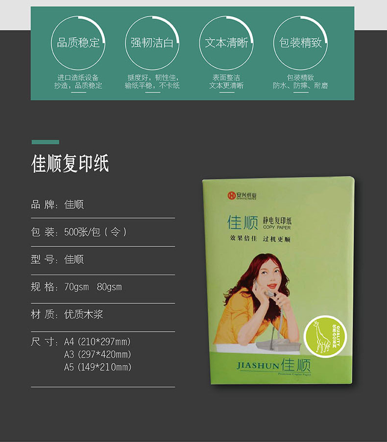 產(chǎn)品名稱 佳順復(fù)印紙 70G A4 500S 5包/箱 貨號 ql000070
