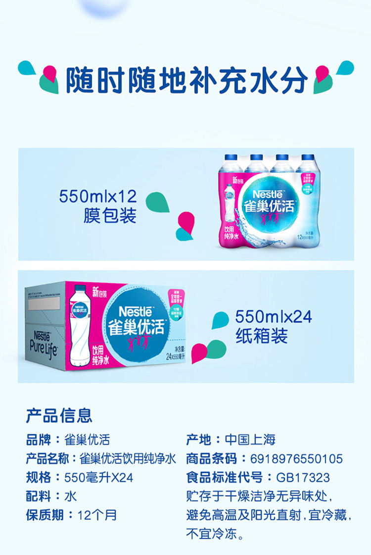 產(chǎn)品名稱 雀巢(Nestle) QCYYS550優(yōu)活飲用水紙箱裝550ml*24瓶 貨號 QL002365