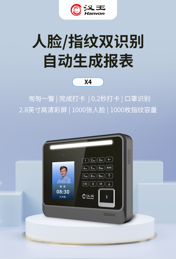 > 辦公設(shè)備 > 行政設(shè)備 > 考勤機(jī) > 漢王(Hanvon)X4人臉指紋混合識(shí)別考勤機(jī) 自動(dòng)生成報(bào)表 無接觸上班打卡面部識(shí)別刷臉機(jī) 免軟件打卡機(jī)