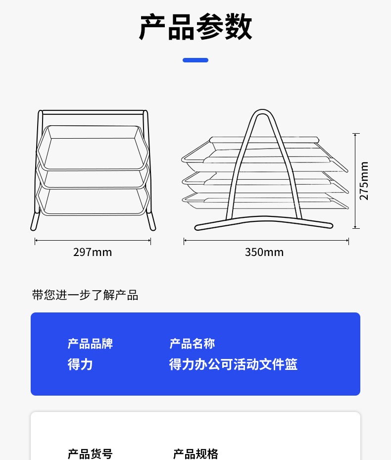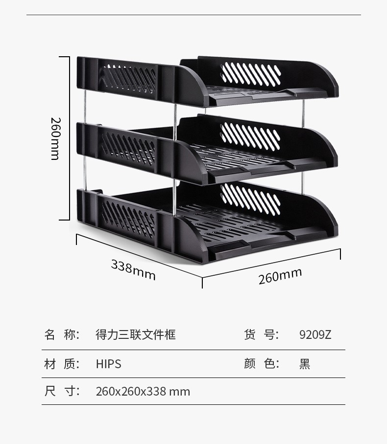產(chǎn)品名稱 得力(deli) 三層鏤空收納文件座 自由拆卸組裝三層文件盤/文件框/文件架 牢固耐用 9206 黑色 貨號 QL002932