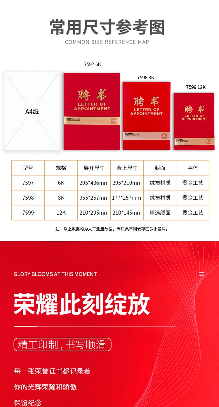 得力(deli)榮譽(yù)證書(shū)聘書(shū)絨面頒獎(jiǎng)得獎(jiǎng)獲獎(jiǎng)獎(jiǎng)狀外殼證書(shū)內(nèi)芯 6K 聘書(shū)(215*295mm)7597