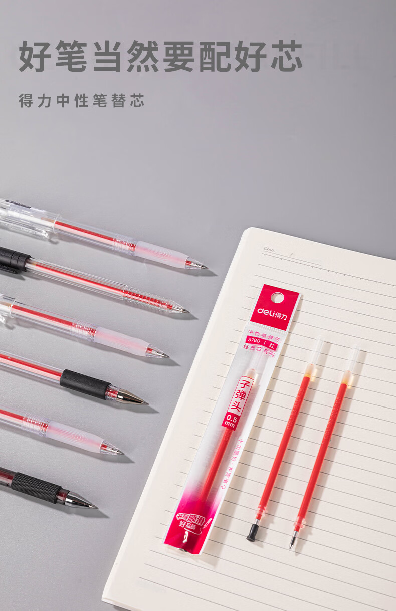 得力S760中性筆芯直拔式可替換替芯0.5mm子彈頭性筆水筆芯紅筆替芯 【S760紅色/20支+6600es】