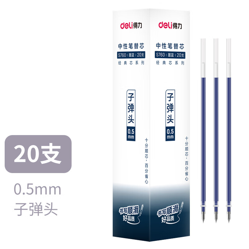 > 辦公文具 > 書(shū)寫(xiě)/修正用品 > 筆芯 > 得力S760中性筆芯直拔式可替換替芯0.5mm子彈頭性筆水筆芯黑筆替芯 【S760墨藍(lán)色/20支+6600es】
