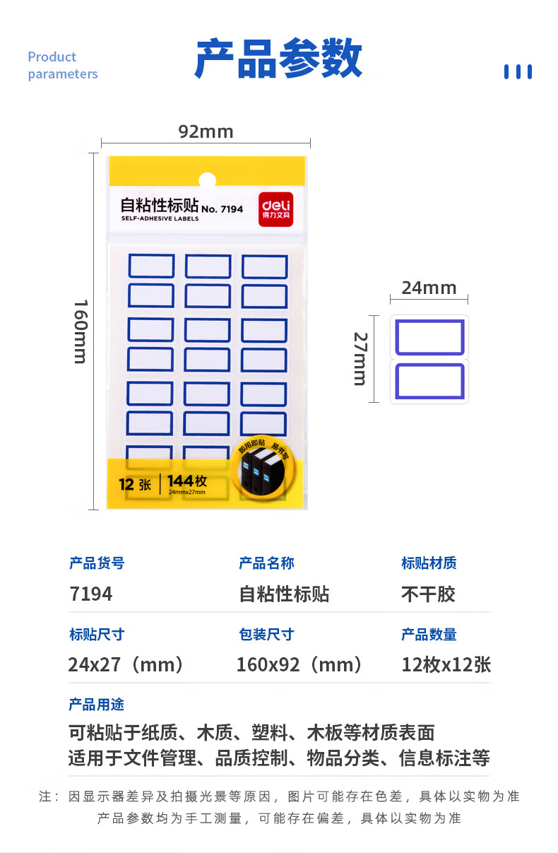 首頁(yè) > 辦公用紙 > 得力(deli) 144枚24*27mm藍(lán)框不干膠標(biāo)簽貼紙自粘性標(biāo)貼姓名貼 7194