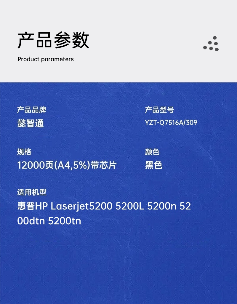 產(chǎn)品名稱 懿智通YZT Q7516A/309黑鼓(帶芯片) 適用惠普HP Laserjet5200 5200L 5200n 5200dtn 5200tn 貨號(hào) QL003649