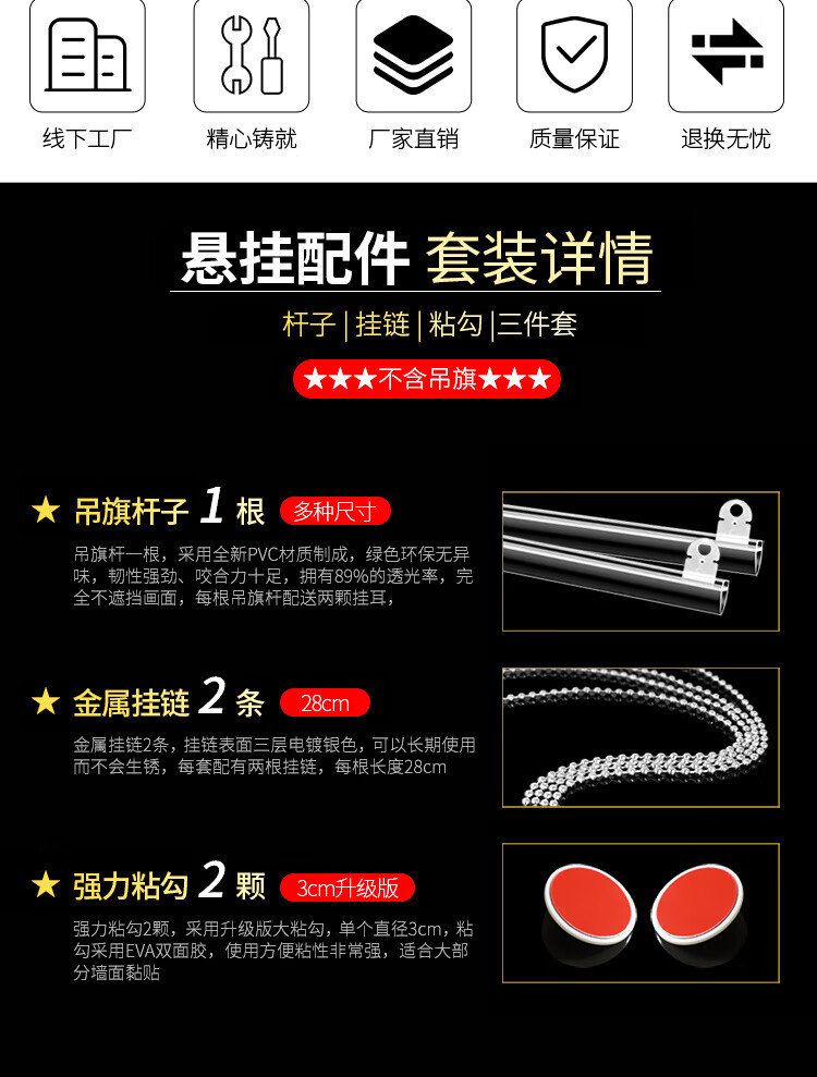 產(chǎn)品名稱 100CM吊旗懸掛桿 PVC海報(bào)桿掛鉤掛鏈三件套 貨號(hào) QL004434